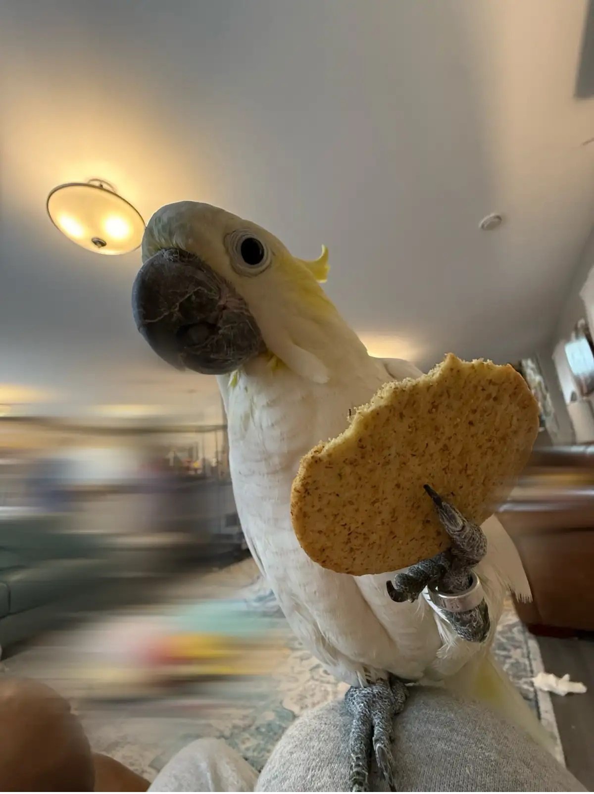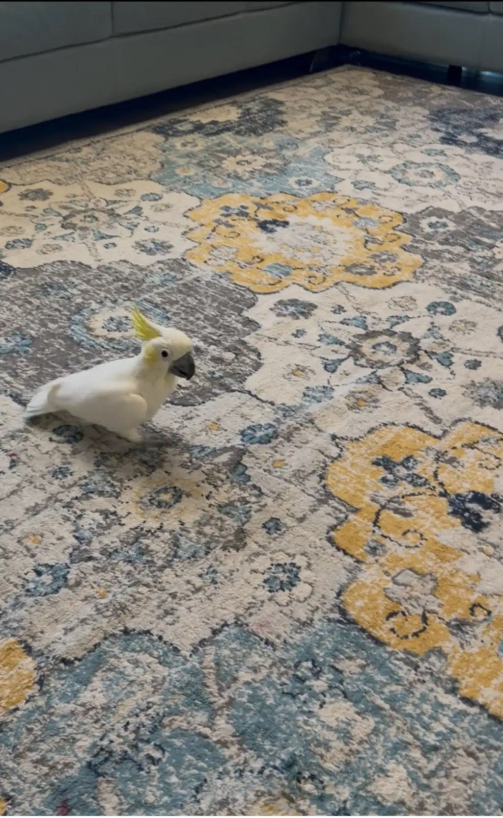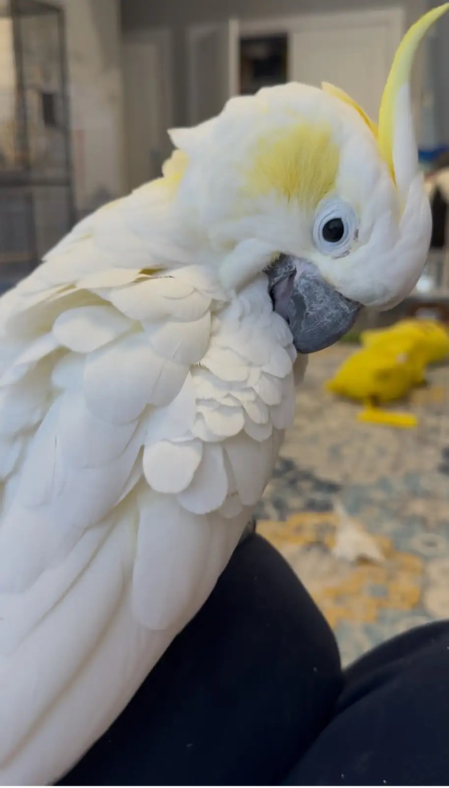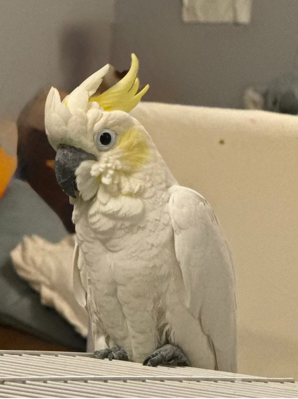 Yellow-crested cockatoos are known as enthusiastic talkers. He can mimic phrases, whistle tunes, and even copy household sounds. His voice has that classic cockatoo tone—slightly raspy but full of character! He thrives on interaction and loves being part of the family. Whether he’s chatting, dancing, or showing off his crest, he’s always entertaining.